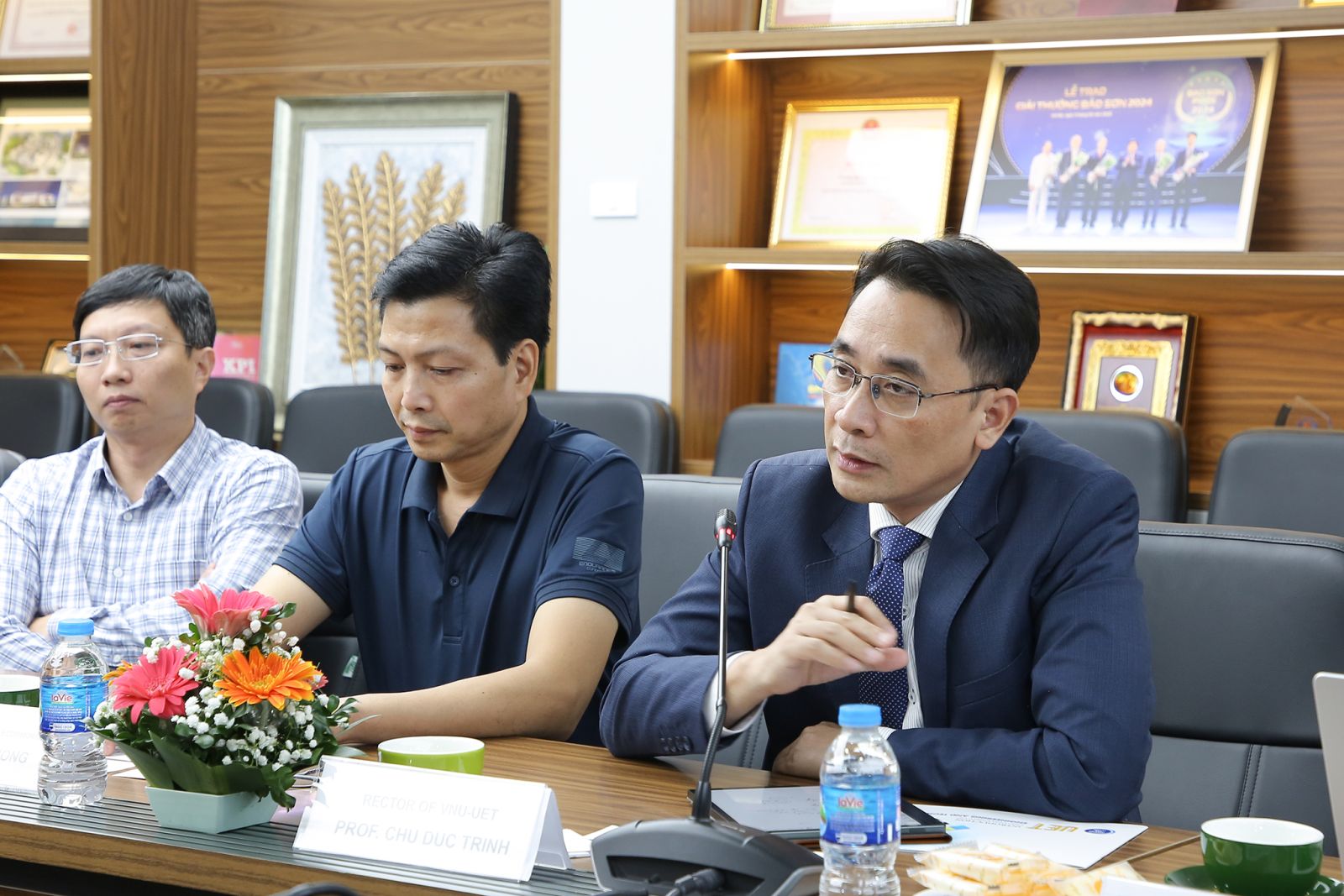Phát biểu tại buổi làm việc, Hiệu trưởng Chử Đức Trình bày tỏ vui mừng được đón tiếp đoàn JAIST và nhấn mạnh mối quan hệ hợp tác lâu dài, hiệu quả giữa hai bên. Hiệu trưởng cho biết, Trường ĐH Công nghệ là nơi có nhiều giảng viên từng học tập và nghiên cứu tại JAIST, đồng thời đánh dấu cột mốc quan trọng khi thành lập Văn phòng Dự án VNU-JAIST đặt tại Trường ĐH Công nghệ từ năm 2007. Thông qua Văn phòng hợp tác này, nhiều hội thảo, chương trình học bổng, hội chợ giáo dục và hoạt động trao đổi học thuật đã được tổ chức, góp phần thúc đẩy hợp tác khoa học giữa hai bên.