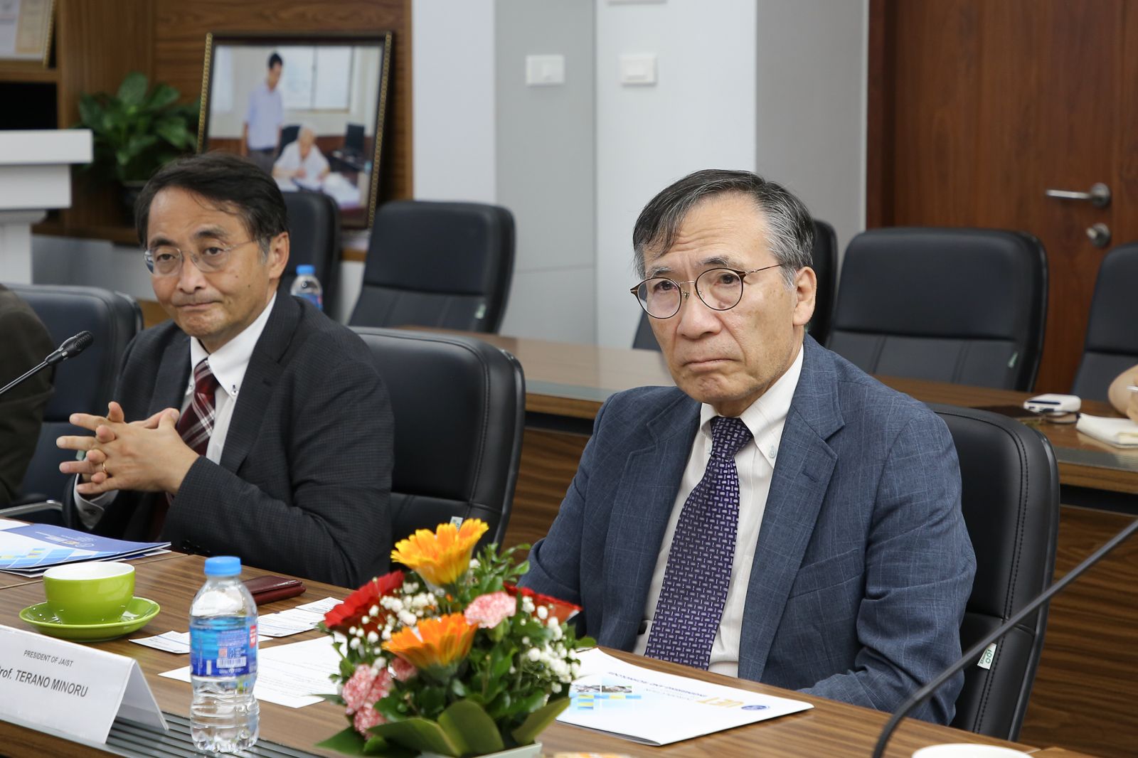 Đại diện JAIST, GS. Terano Minoru – Chủ tịch bày tỏ niềm vui khi được thăm và làm việc tại Trường ĐH Công nghệ, đồng thời đánh giá cao tầm nhìn chiến lược và năng lực nghiên cứu của Nhà trường trong các lĩnh vực công nghệ cao. Ông nhấn mạnh mong muốn làm sâu sắc hơn mối quan hệ hợp tác, đặc biệt trong đào tạo nguồn nhân lực chất lượng cao cho ngành công nghiệp bán dẫn và trí tuệ nhân tạo, cũng như mở rộng các dự án nghiên cứu chung giữa hai bên.
