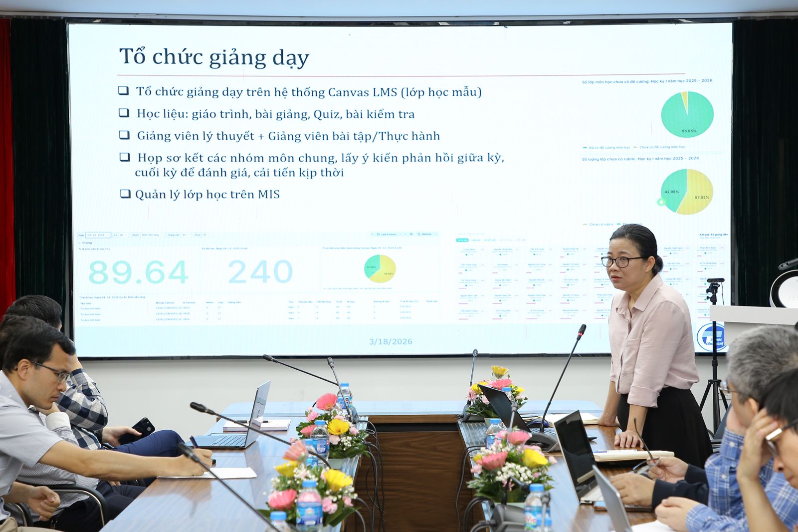 Từ các dữ liệu trên, Trưởng phòng Đào tạo nhấn mạnh việc tiếp tục nâng cao chất lượng giảng dạy, tăng cường tương tác giữa giảng viên và người học, chuẩn hóa học liệu và minh bạch hóa cấu trúc đánh giá, qua đó giúp sinh viên nhanh chóng thích nghi với môi trường đại học. Đặc biệt, báo cáo đề cao vai trò của hệ thống Canvas LMS trong việc tổ chức và quản lý hoạt động dạy – học, đánh giá chuẩn đầu ra học phần, tạo điều kiện để sinh viên chủ động tiếp cận tri thức, từ đó hình thành và tăng cường văn hóa tự học bền vững.
