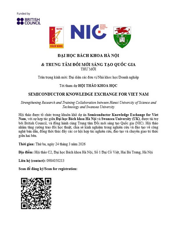 Nam, với sự hợp tác giữa Đại học Bách khoa Hà Nội và Swansea University (UK), được tài trợ bởi British Council, và đồng hành cùng Trung tâm Đổi mới sáng tạo Quốc gia (NIC). Hội thảo nhằm tăng cường trao đổi học thuật, chia sẻ kinh nghiệm trong nghiên cứu và đào tạo về công nghệ bán dẫn, đồng thời thúc đẩy các cơ hội hợp tác nghiên cứu, đào tạo và chuyển giao tri thức giữa hai bên.
